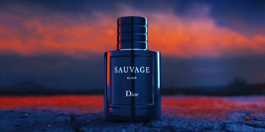 Uma garrafa de Dior Sauvage Elixir contra um fundo escuro do pôr do sol.