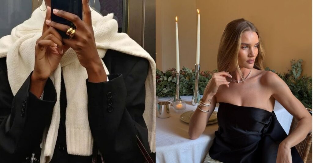 Uma foto de Rosie Huntington-Whiteley vestindo uma blusa preta sem alças, sentada em uma mesa de jantar com castiçais prateados